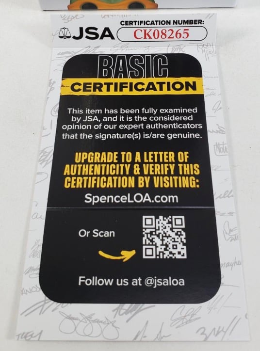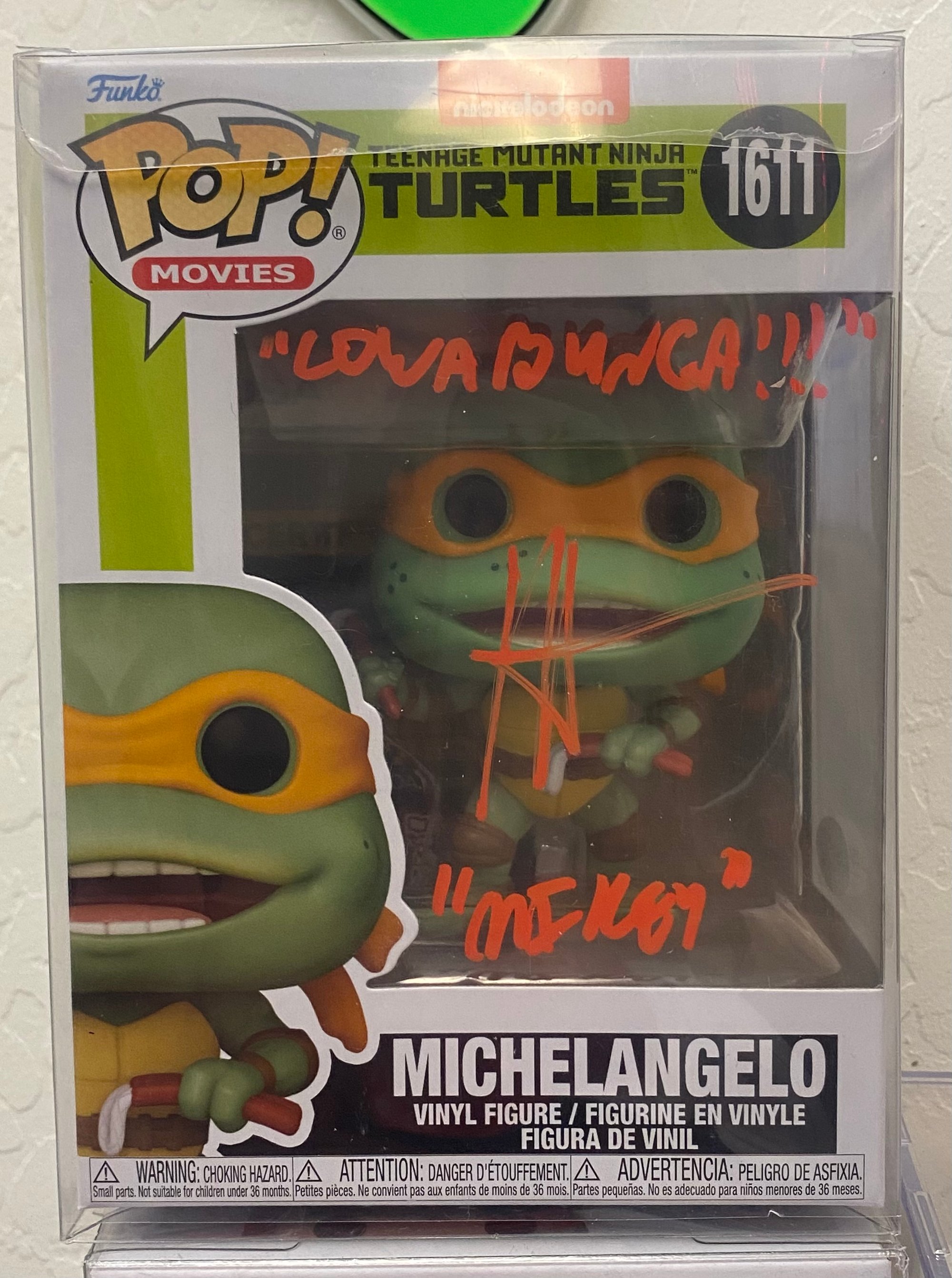 This is a autographed Funko Pop Vinyl Figurine has been personally hand-signed by Robbie Rist "Cowabunga" & "Mikey" from Teenage Mutant Ninja Turtles. This autograph is certified by James Spence Authentication (JSA). It comes with the numbered hologram and matching Certificate of Authenticity.